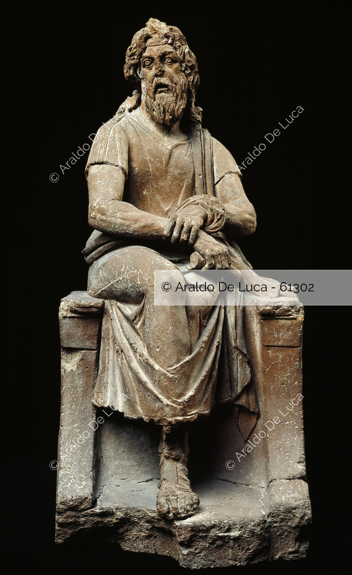 Estatuilla de terracota que decoraba el jardín de la casa. Los marcados rasgos faciales permitieron identificar la estatuilla con el filósofo ateniense Antístenes, alumno de Sócrates y fundador de la escuela de los cínicos. Muestra al filósofo sentado, con túnica, zapatos y pergamino en la mano.
